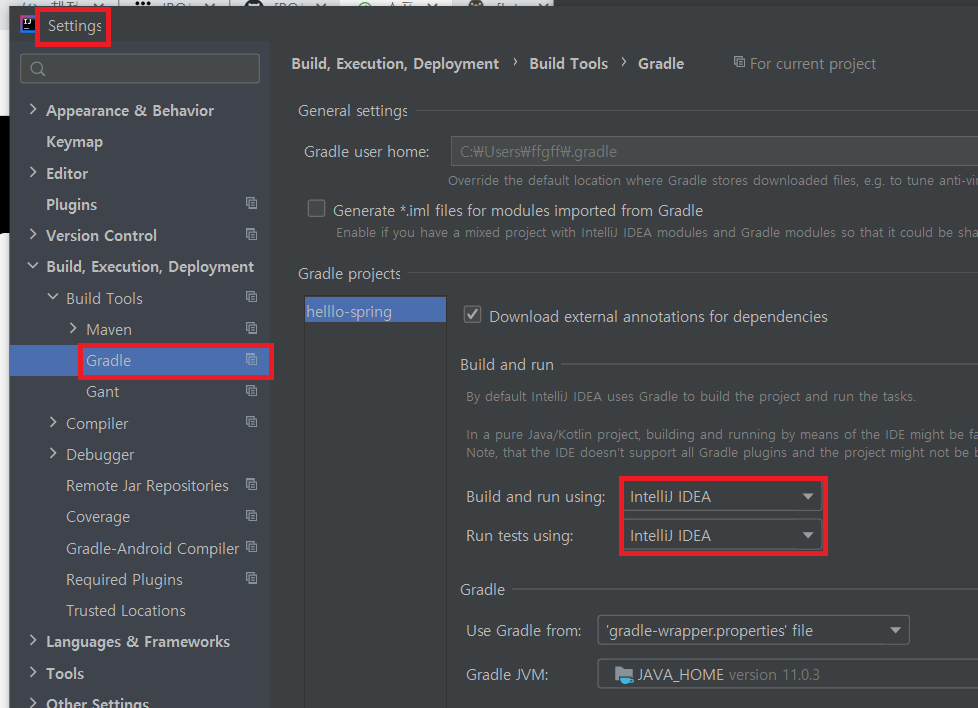 1) File > Settings > Gradle > Build and Run 부분 두 가지 옵션을 다 intelliJ IDEA로 바꿔준다.