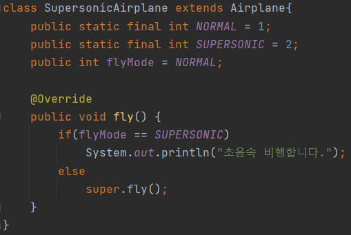 - 자식 클래스 내부에서 오버라이딩된 부모 클래스의 메소드를 호출해야 하는 상황이 발생한다면, 명시적으로 super 키워드를 붙여 부모 메소드를 호출할 수 있다.