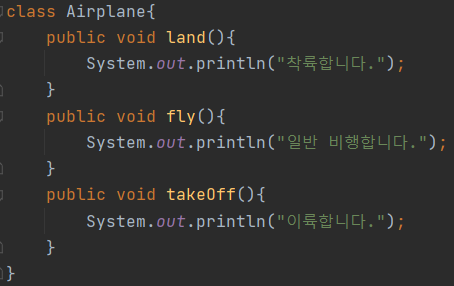 - 모든 실체들이 가지고 있는 메소드의 실행 내용이 동일하다면 추상 클래스에 메소드를 작성하는 것이 좋지만, 메소드 선언만 통일화하고, 실행 내용은 실체 클래스마다 달라야 하는 경우가 있다.