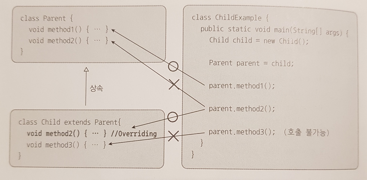 - 메소드가 오버라이딩되었다면, 부모 객체의 메소드는 숨겨지고 오버라이딩된 자식 메소드가 호출된다.