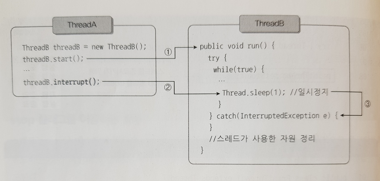 - 주목할 점은 스레드가 실행 대기 또는 실행 상태에 있을 때 interrup() 메소드가 실행되면 즉시 InterruptedException 예외가 발생하지 않고, 스레드가 미래에 일시 정지 상태가 되면 예외가 발생한다는 것이다.