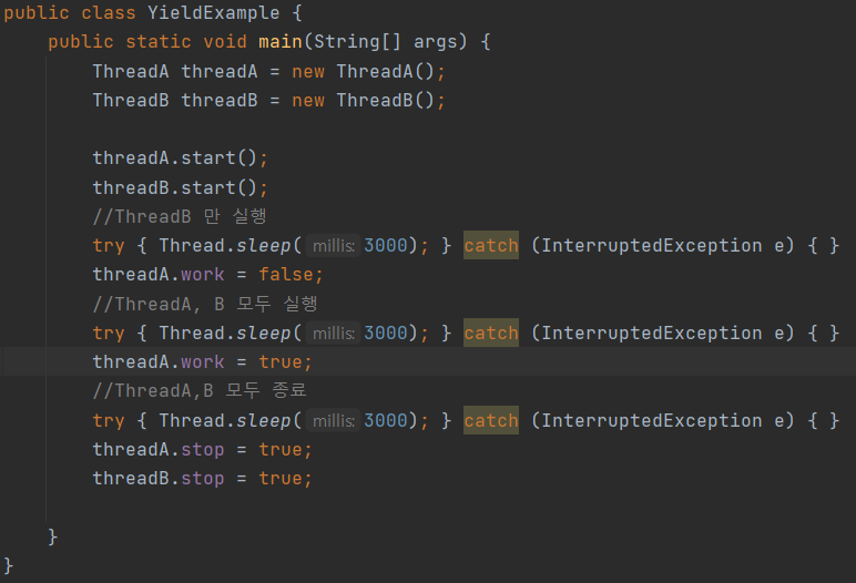 - 3초 뒤 메인 스레드가 ThreadA의 work 필드를 false로 바꿔 A는 yield() 메소드를 호출한다.