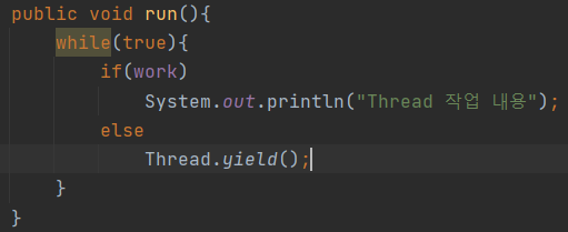 - 이것보단 다른 스레드에게 실행을 양보하고 자신은 실행 대기 상태로 가는 것이 전체 프로그램에 성능을 높여준다.