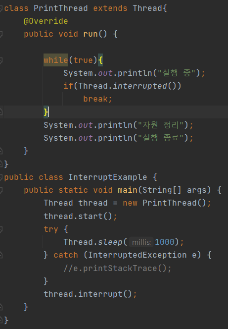 - 따라서 스레드가 일시 정지 상태가 되지 않는다면 interrupt() 메소드 호출은 아무 의미가 없다. 그래서 짧은 시간이나마 일시정지 하기 위해 Thread.sleep(1)을 사용한 것이다.