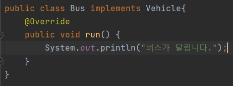 - 추상 메소드는 리턴 타입, 메소드명, 매개변수만 기술되고 { }는 붙이지 않는 메소드이다.