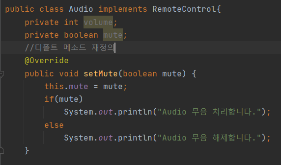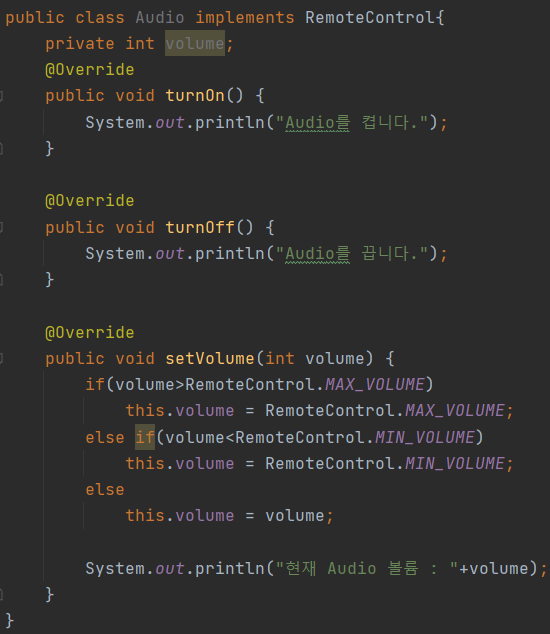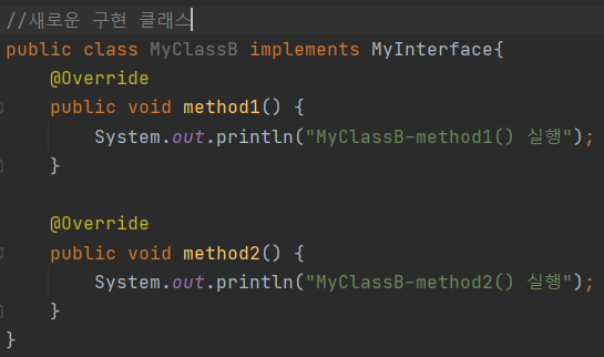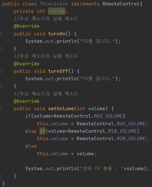 - 구현 클래스에서 추상 메소들에 대한 실체 메소드를 작성할 때 주의할 점은 인터페이스의 모든 메소드는 기본적으로 public 접근 제한을 갖기 때문에 public보다 낮은 접근 권한으로 작성할 수 없다.