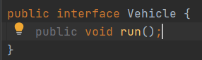 - 인터페이스에 선언된 추상 메소드는 모두 public abstract 특성을 갖기 때문에 public abstract를 생략하더라도 자동적으로 컴파일 과정에 붙는다.
