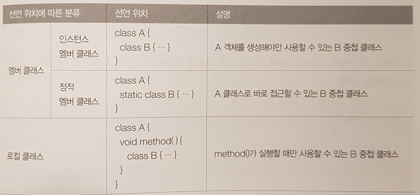 - 중첩 클래스는 클래스 내부에 선언되는 위치에 따라서 두 가지로 분류된다. 클래스 멤버로서 선언되는 멤버 클래스, 메소드 내부에서 선언되는 로컬 클래스가 있다.