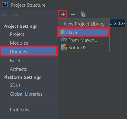 5. Libraries > "+" 추가 버튼 선택 > Java 선택